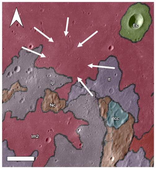 Fracastorius dome area (as outlined by the white arrows) and surrounding region overlain with the unified global lunar geologic map from the USGS Astrogeology Science Center, accessed using LROC Quick Map. The units displayed are: Ip (Imbrian plains unit); Im2 (Upper mare unit); It (Terra unit); Nc, Icc, Ec (crater units). Scale bar 20 km.
