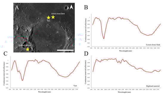 The M3 spectrum of Fracastorius dome (Figure 4) displays a trough ~1000 nm with a minimum wavelength at 980 nm and an absorption band ~2200 nm. This corresponds to a typical high-Ca pyroxene signature [27], indicating a basaltic composition. The highland material to the north of the dome displays a spectrum of a more feldspathic composition, which also lacks any observable mafic absorption feature in the range between 1000–2400 nm. Thus, the Fracastorius dome consists of basaltic material.