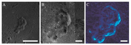 Images of the irregularly shaped vent at Fracastorius dome. (A) WAC image with scale bar of 5 km; (B) NAC image with scale bar 1000 m (with large inclination of 55–80° and resolution of 0.5 m/px) overlain on the WAC Global Morphological basemap; (C) High-resolution lunar topography (SLDEM2015)—Slope image with scale bar 1000 m from the 512 ppd SLDEM2015+LOLA product, obtained using LROC Quick Map. Slopes from [28].