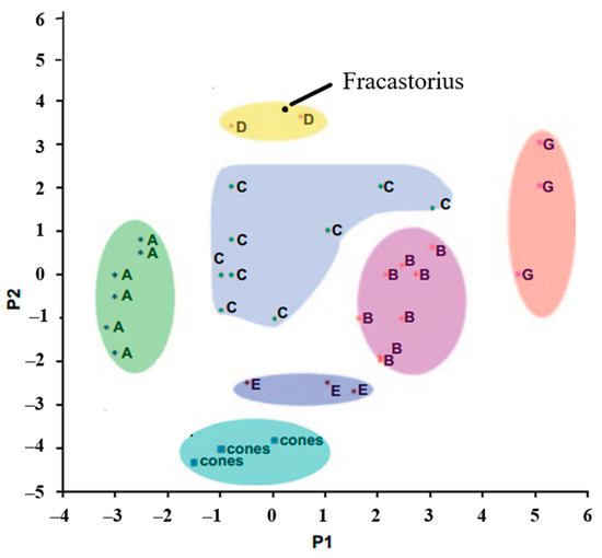 Classification scheme of effusive lunar mare domes introduced in reference [27,37]. In this subspace lunar domes form several clusters, which can be identified based on the correspondingly transformed dome coordinates, where the main groups appear in the coordinate system spanned by the first two principal components P1 and P2. The examined Fracastorius dome belonging to class D is marked.