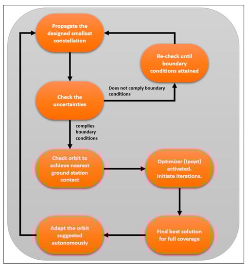 In the near future, this research will be further enhanced with unique techniques to control and effectively implement autonomous functions in small satellites, overcoming their constraints such as compact size and on-board resource availability and improve the functions in constellations. Additionally, the verifications for the optimization of the constellation coverage may be carried out in the near future to test the method on the real-time constellations. The social implementation of this technique in real-time will depend on the realization of effective constellations in the near future. There are plans to validate this technique through current constellations through a collaborative effort, which is under due consideration mainly to contribute towards the disaster management applications. This is not only for the real-time applications in a cost-effective manner in LEO, but also to support and strategize deep-space missions efficiently for a long-term operation and productive lifecycles. Figure 23 describes the direction and focus of this research pictorially and Ref. [32] adds essence to continuous research for small satellites constellations.