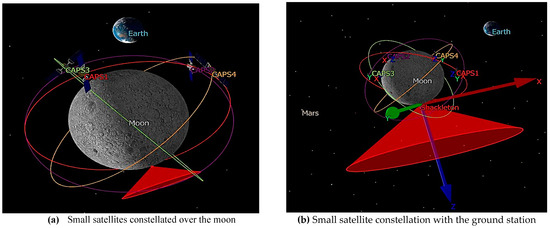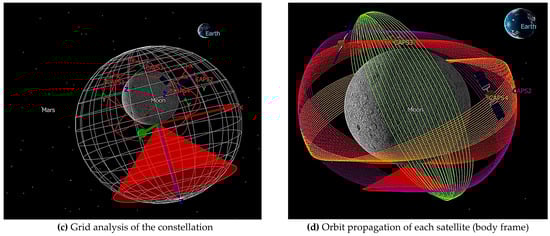 The consideration to Equation (3) in Section 2 is duly given for the design constraint in the lunar constellation case as well. However, as the operating satellites are only four in different planes, if they satisfy the 10-degree elevation angle requirement of the ground station, it is enough to communicate with the Shackleton ground station and in future using the optimization, best solutions for the orbit’s cost, coverage, and objective function can be obtained with an added number of satellites if needed for lunar operations.
