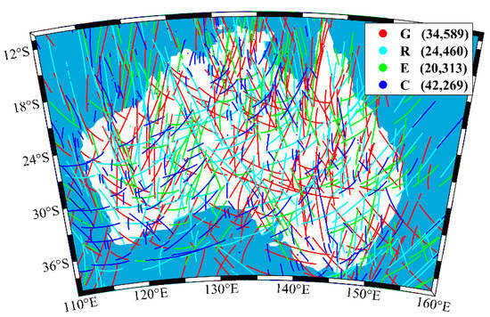 In this research, the raw multi-constellation GNSS code and phase observations are employed by un-combined PPP to estimate the ionospheric observations which are later used for generating the RIMs over Australia, considering that more constellations will improve the distribution of the ionospheric penetration points (IPPs) and increase redundant observations in the VTEC modelling. Since the commonly-used carrier-to-code leveling (CCL) method is easily affected by code noises, multipath effects and arc length [30,31], and the un-combined dual-frequency PPP (UC-DFPPP) method, which is proven to be flexible and effective [32,33,34], are applied to extract precise ionospheric observables. For convenience of analysis, the generated RIMs are referred to as RIM4, RIM2, RIMG, and RIMC, representing the RIMs modelled from quad-constellation (GREC), dual-constellation (GC), GPS-only, and BDS-only data, respectively.