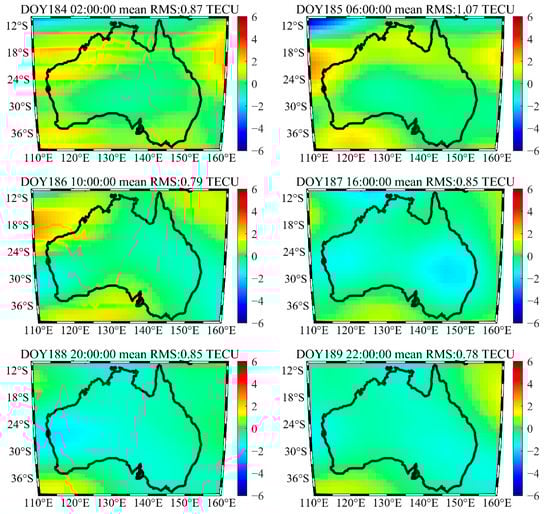 Based on the estimated ionospheric coefficients, the gridded RIMs over Australia can be generated hourly. First, the reliability of the RIMs was validated and assessed by comparing with the CODE-GIMs. Six of these comparison maps was selected for presentation during the experiment, which covered the entire day. Figure 3 shows the difference in VTEC between RIM4 and CODE-GIM with the RMS statistics shown at the top of each panel. As illustrated, the TECs calculated by RIM4 conforms well to the CODE-GIMs, with most biases within two TECUs, except for the marginal areas where IPPs are insufficient.