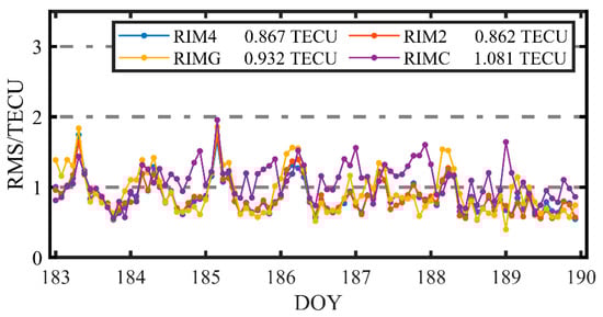 Next, we present the RMS time series of VTEC differences between all RIMs and the CODE-GIM in Figure 4. The RMS statistics of RIMs from BDS3-only (RIMC), GPS-only (RIMG), GPS/BDS-3 combined (RIM2), and four-system combined solutions (RIM4) are indicated by purple, yellow, red, and blue dotted lines, respectively. It can be seen that the four RIMs are all in good agreement with the CODE-GIMs with the RMS of VTEC differences within two TECUs. The RIMC has the largest deviation with an average RMS of 1.081 TECUs, whereas the corresponding RMS of RIMG is 0.932 TECUs. As the CODE-GIM is generated from a combination of GPS and GLONASS observations, the RMS of RIM2 (0.862 TECUs) and RIM4 (0.867 TECUs) are comparable and better than the RIMC and RIMG. Considering that the final products from CODE have a nominal accuracy of two–eight TECUs, it can be concluded that the method of the RIMs with the quad-constellation raw observations performs well and can enhance the reliability of the VTEC model in comparison to single-constellation RIMs.