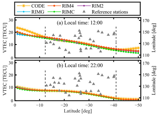 To further compare the accuracy of the four RIMs, the VTEC results for each ionospheric model at local time 12:00 (hh:mm) (a) and 22:00 (hh:mm) (b) for the central longitude of Australia (135°E) are shown in Figure 5. We can clearly see that the VTEC values decrease with the increase of latitude, and that the VTEC values at noon are greater than that at night. Since the ionosphere is more active at noon during the day, it can be seen that the difference between RIMs is more pronounced at 12:00 (hh:mm) than 22:00 (hh:mm), especially at the edges of experiment area. For comparison purposes, the locations of the reference stations are also depicted in the diagram (grey triangles). It is clear that in the area of dense station distribution as shown between two vertical black dotted lines (−12°S to −41°S), the VTEC values are essentially the same for the different models. Combining Figure 4 and Figure 5, it is apparent that the accuracy of RIMG and RIMC is already relatively high with more stations, and that the improvement in performance of the RIM4 is mainly at the edges of the survey area and over the ocean. In addition, due to its high volume of visible satellites in the Asia-Pacific region, the BDS has ionospheric monitoring capabilities equivalent to the GPS over Australia. Therefore, monitoring the ionospheric variations with BDS satellites is also an alternative when the number and signal of GPS satellites is poor.