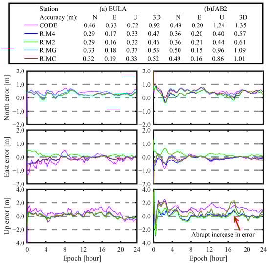 In this section, we apply the generated four RIMs, as well as CODE-GIM, to the BDS kinematic IC-SFPPP and comparatively evaluate the positioning performance of different IC-SFPPP results. The datasets on DOY 184, 2021, from two stations, BULA (−22.91°S, 139.90°E) and JAB2 (12.66°S, 132.89°E), are selected as the user stations. The former station is in the central region of Australia, whereas the latter one is at the edge. The true coordinates of two stations are given by the average coordinates of the static DFPPP results over 1 day. The time series of positioning errors in five different SFPPP modes are shown in Figure 6, with statistics information shown at the top. Firstly, it is shown that the positioning accuracy of SFPPP with CODE-GIM correction are worse than the other four cases, and the RMS at BULA is 0.46 m, 0.33 m, and 0.72 m in the north, east, and upwards directions, respectively. Overall, the time series of positioning errors while introducing the RIMs into the SFPPP model are more precise and the horizontal performance is better than the vertical one. The statistics information shows that the different RIM corrections in the IC-SFPPP model have little effect on the positioning performance at BULA, whereas the 3D RMS of RIM4, RIM2, RIMG, and RIMC is 0.471 m, 0.461 m, 0.527 m, and 0.518 m, respectively. That is to say that the RIMG and RIMC can already provide ionospheric information with high spatial resolution to serve SFPPP users with decimeter accuracy, whereas the improvement of the positioning accuracy by using RIM4 and RIM2 is only several centimeters in each direction. In contrast at JAB2, the 3D RMS of the RIM4 (0.574 m) is significantly better than the RIMG (1.087 m) and the RIMC (1.007 m), especially in the upwards direction. Additionally, the errors in RIMG and RIMC increase abruptly at some moments (marked with red arrows in the figure), which are due to fewer IPPs at the edge in the regional ionospheric modelling. Therefore, it is concluded that RIM with multi-constellation observations can effectively increase the number of IPPs and compensate for the lack of accuracy for the RIMs at the edges.