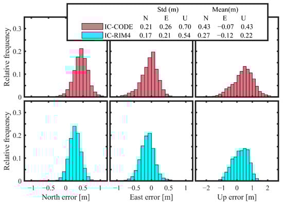 The positioning errors at all monitoring stations are then calculated while introducing CODE-GIM and RIM4 into the SFPPP model. The distributions of positioning errors in the three directions are shown in Figure 7 with statistics information shown at the top. It is shown that the STD of IC-SFPPP with CODE-GIM correction are 0.21 m, 0.26 m, and 0.70 m in north, east, and upwards direction, respectively, whereas IC-SFPPP with RIM4 correction performs better than that with CODE-GIM, with STD of 0.17 m, 0.21 m, and 0.54 m in the three directions. In the upwards direction, the mean errors and STDs are improved from 0.43 m and 0.70 m to 0.22 m and 0.54 m, respectively. In general, the IC-SFPPP with the RIM4 has a better precision and better positioning performance.
