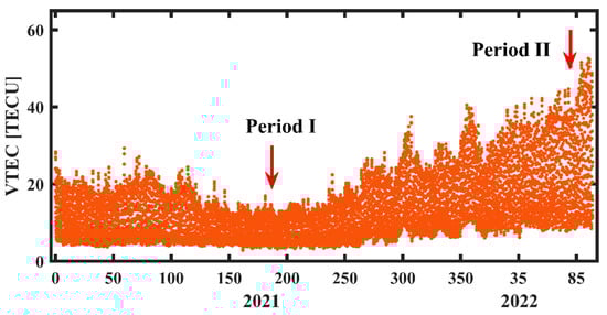 Then, according to the CODE GIM products, the mean VTEC values of all grid points over Australia (0°S–50°S, 110°E–160°E) are calculated and shown in Figure 8. As shown, the VTEC values fluctuate smoothly throughout 2021, and increase sharply in 2022, indicating that the ionosphere is more active in 2022. To further evaluate the application effectiveness of the RIMs in different ionospheric periods, observations from DOY 183–189, 2021 (Period I), and DOY 77–83, 2022 (Period II), are collected and utilized in the IC-SFPPP model in the following. Table 6 presents the RMS and percentage improvement compared to the CODE-GIM in the horizontal, vertical, and 3D components for both periods.