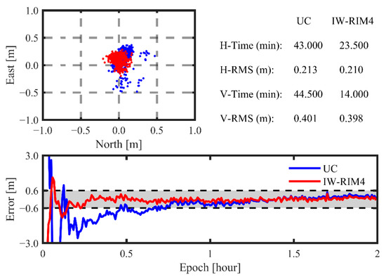 In this section, BDS IW-SFPPP is utilized to comparatively evaluate the RIMs applications in the terms of positioning accuracy and convergence time. The observations from all 30 reference stations and 10 monitoring stations are collected in the analysis. Furthermore, the convergence time is defined as when the positioning errors in the horizontal and vertical directions are less than 0.3 m and 0.6 m, respectively [51], for 20 consecutive epochs. Figure 9 shows the positioning error of the horizontal (top) and upwards (bottom) directions at station STHG on DOY 184, 2021, whereas the UC-SFPPP results and corresponding statistics are also shown for comparison. It is shown that the convergence time of UC-SFPPP in the horizontal and vertical direction is 43.0 min and 44.5 min, respectively, which is reduced to 23.5 min and 14 min by using the RIM4 in the IW-SFPPP model. Undoubtedly, RIM4 play a crucial role in the early filter processing with the adoption of additional ionospheric pseudo-observations, while its impact on the positioning accuracy is weakened slightly after convergence.