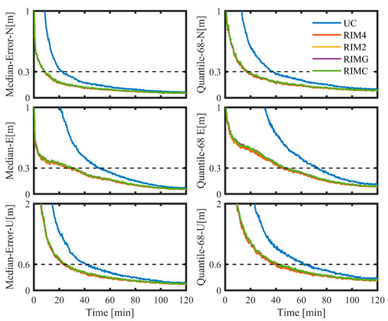 To further compare the application performance of four different RIMs, we divide each RINEX observation file over 24 h into six periods and evaluate the convergence performance every 4 h to ensure that the filtering has enough time to converge to the threshold value. Then, the IW-SFPPP performance in terms of convergence time is evaluated at the median and 68% quantiles in kinematic mode [3]. Figure 10 and Table 7 presents the statistics of 1680 samples (7 days × 40 stations × 6 initializations) in three directions. Obviously, both the median and 68% quantile results indicate that the convergence time of the BDS UC-SFPPP can be accelerated using the RIMs in the IW-SFPPP model, and RIM4 shows the fastest convergence overall. Among the median results, the time reduction by using the RIM4 is 13.0 min (57.8%), 26.5 min (51.0%), and 19 min (45.8%) in the north, east, and upwards direction, respectively, whereas at the 68% confidence level, the convergence time was reduced by 52.7% (from 37 min to 17.5 min), 37.2% (from 72.5 min to 45.5 min), and 37.1% (from 62.0 min to 39.0 min) compared with the UC-SFPPP performance. Additionally, the RIMC performs at the same level as the RIMG. This suggests that the accuracy of the RIM generated by a single system is sufficient for accelerating the convergence of the IW-SFPPP compared with the UC-SFPPP, whereas the more constellation observations used for RIM products, the faster the convergence time of IW-SFPPP.