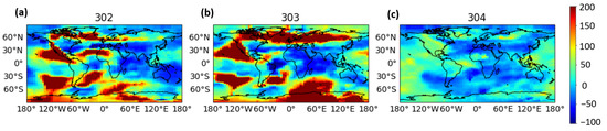 The relative total electron content (TEC) with respect to the preceding 27-day median (calculated according to Equation (1)) for the Halloween storms that occurred on 29 and 30 October 2003. The relative TEC is calculated using the UQRG global ionosphere maps (GIMs) from the Universitat Politècnica de Catalunya (UPC) analysis center. The main phase of the storms was on 29 and 30 October, which are day of year (DOY) 302 and 303, respectively. The recovery phase lasted several days, until 3–4 November 2003. The relative TEC percentages are plotted at 22 universal time (UT) for 29–31 October, which corresponds to DOY 302 (a), 303 (b) and 304 (c), respectively.