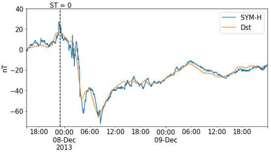 The geomagnetic storm time disturbance index Dst plotted together with the SYM-H index during a geomagnetic storm that occurred on 7–9 December 2013. The storm’s onset time (the time where maximum Dst is seen right before it starts decreasing), which corresponds to storm time = 0, is plotted as the dashed black line.