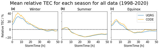 Comparison of the relative TEC between the UQRG from UPC and Center for Orbit Determination in Europe (CODE) GIM data as a function of storm time (averaged over the complete region) plotted for winter (a), summer (b) and equinox (c). The classification into seasons was performed according to the DOY listed in Table 1. Storm time equals zero corresponds to the time where the Dst index was maximum, right before it started decreasing.