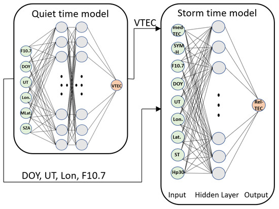 The paper is divided into five sections, beginning with a brief description of different NN-based ionospheric TEC models and their capability of predicting TEC accurately during storms. Section 2 explains the database and sources needed for the model development. The method used for designing the storm-time NN-based model’s architecture is discussed in Section 3. Section 4 provides a performance evaluation of the storm-time NN model compared to an NN-based quiet-time model [17] and the Neustrelitz TEC model (NTCM) [20], which is a computationally very fast 12-coefficient model that uses the daily solar flux F10.7 as a driving parameter. The storm-time NN-based model is further evaluated with respect to its capability of predicting TEC using the quiet-time model outputs as an input for the storm-time model in order to improve the quiet-time model’s accuracy. The conclusions are given in Section 5.