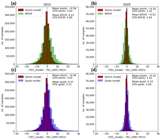 The performance of the storm model, quiet-time model and Neustrelitz TEC model (NTCM) in TECU. The left panels (a,c) correspond to the high-solar-activity (HSA) year in 2015 and the right panels (b,d) to the low-solar-activity (LSA) year in 2020.