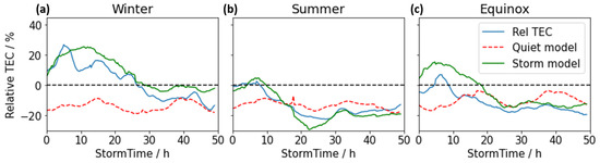 The performance of the quiet-time and the storm-time model in relative TEC as a function of storm time (averaged over complete region) for the test data set (2015 and 2020) during winter (a), summer (b) and equinox (c). The classification into seasons was performed according to the DOY listed in Table 1.