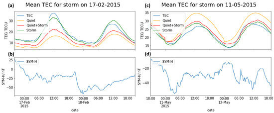 In the top panel is the UQRG TEC (blue curve) plotted together with the predicted TEC by the quiet-time model (orange curve), storm-time model (green curve) and the storm-time model coupled with the quiet-time model (red curve) for a geomagnetic storm on 17 February 2015 (a) with the SYM-H index plotted at the same time (b). The same is plotted for another storm that occurred on 11 May 2015, shown in (c) together with the corresponding SYM-H index (d).
