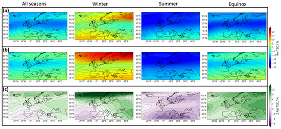 The relative TEC for the European region averaged for all storms in the test dataset (storms during 2015 and 2020) from the GIMs in panel (a), the predictions in panel (b) and the difference maps in (c). The difference maps were computed by subtracting the GIMs relative TEC from the predictions. The classification into seasons was performed according to the DOY listed in Table 1. The top colour bar corresponds to panel (a,b). The colour bar in the bottom to panel (c).