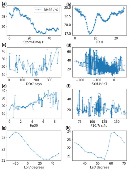 The RMSE of the relative TEC plotted for different parameters which are the storm time (a), local time (b), DOY (c), SYM-H (d), Hp30 (e), F10p7 (f), longitude (g) and latitude (h) for all the storms in the test dataset.