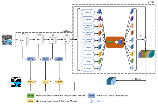 This research introduces a unique semantic segmentation deep learning network. It performs incredibly well in real time land cover segmentation. Its frame structure is shown in Figure 1. In its composition, as the foundation network for extracting features, we employ the modified ResNet50. Then, this paper presents a multi-scale feature extraction space pyramid module. Its goal is to combine the context data from several places, enhancing the ability to obtain global information, so as to accurately and effectively identify regions of any scale. Next, a multi-scale feature fusion module is constructed to combine various scale features, which is crucial for enhancing performance. Compared with high-level features, low-level features have more location, detail, and better resolution data, less convolution, lower semantics, and more noise. Although high-level characteristics have weaker resolution and poorer detail perception, they have stronger semantic information. The multi-scale feature fusion module is utilized to fully integrate low-level features and high-level features. Finally, a multi-scale convolutional attention module is suggested. It can efficiently lmitigate the interference of invalid targets, enhance the detection effect of concerned targets, and improve the attention to buildings and waters in land cover images and change the allocation of resources according to the importance of the target. It allocates more resources to the object of attention [25], and thereby increases the model’s total segmentation accuracy, which makes the real-time semantic segmentation of land cover more precise.