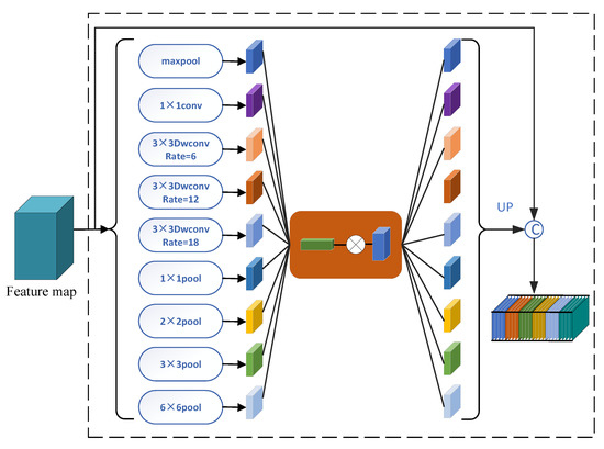 Capturing multi-scale context data is crucial for semantic segmentation in order to gather comprehensive data. The land cover image has a complex background and crisscrossed rivers and houses. Therefore, it is necessary to design a module to aggregate multi-scale context information to solve the problem of context information loss, which could cause blurred edge and undetectable small targets, thereby improving the accuracy of the real-time semantic segmentation of land cover. Therefore, to combine the context information from several locations and enhance the capacity to access global information, this research refers to pyramid pooling module in PSPNet [31]. The ASPP module of DeepLabv3Plus network of classical convolutional neural networks is also referenced. In order to ensure the image resolution, the dilated convolution is employed to expand the receptive field of land cover image information. Figure 2 illustrates its particular structure.