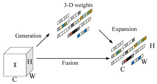 where is a nonlinear activation function [36], a represents height, and b represents width. f is then split into two distinct tensors and along the spatial dimension. Two 1 × 1 Conv and are used to transform the feature maps and to the same number of channels as the input X. The outcome is as shown below.