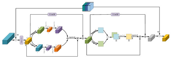 A crucial component of the multi-scale convolution attention module is the SimAM module [38]. The spatial attention or channel modules are distinct from the SimAM module. Without using any other parameters, the module produces 3D attention weights for the feature map. The 1D channel attention module treats different channels differently and treats all locations equally [39]. The 2D spatial attention module treats different locations differently and equally for all channels [40]. Compared with the existing channel and spatial attention modules, it provides three-dimensional attention weights for feature mapping in the feature layer. In the face of the complex and diverse background of land cover, it is often difficult for ordinary attention modules to combine such complex variables, but the SimAM module maps the three-dimensional attention weight, which solves the pain point that the attention module does not perform well in the complex backgrounds. Its particular structure is displayed in Figure 4.