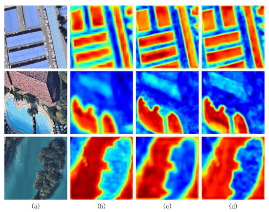 Figure 6b,c show the visual effects of buildings or waters without or with MFFM. By comparison, we find that models with MFFM can identify targets more clearly and focus more on the building and the waters. The segmentation results without MFFM are more blurred, and the attention to housing construction and the water area is not enough, as in the other modules. Heat maps better demonstrate this effect.