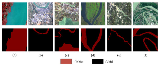 Waters’ segmentation dataset part of the picture display. (a) Sea; (b) Urban residential area; (c) Coastal area; (d) Rivers; (e) Highland area; (f) Terraced area.