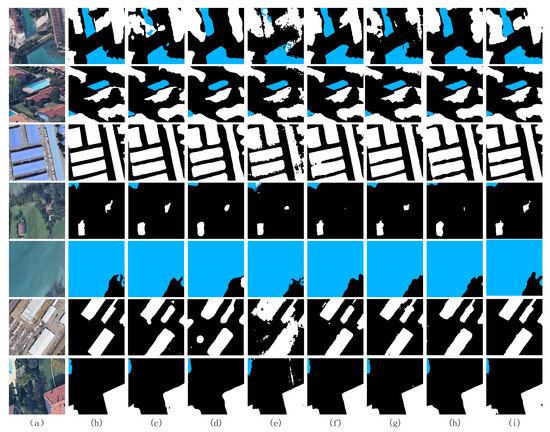 According to Table 3, the proposed model can achieve high-precision real-time semantic segmentation of land cover datasets. To demonstrate the effectiveness of our approach, Figure 10 shows some comparison experimental results of the semantic segmentation of land cover. The segmentation results of our network are contrasted with the segmentation results of the classical models, where white represents the building, blue represents the water, and black represents the default background.