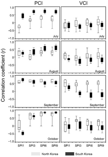 Figure 1 shows the boxplot of the monthly correlation coefficients between SPIs from 61 stations and PCI/VCI averaged over cropland. The monthly patterns were analyzed from July to October because transplanting was conducted in June (paddy is flooded) [33]. There is a notable difference between North Korea and South Korea in Figure 1. Both VCI and PCI show the same correlation patterns in North Korea, while the patterns are opposite in South Korea. As mentioned above, PCI has positive relationships with SPIs in both North Korea and South Korea whereas VCI has negative relationships with SPIs in South Korea. Although both PCI and SPI were calculated using precipitation, the correlations with SPIs were not as high as expected because of the normalizing approaches, data source, and different periods. PCI, which is based on the TRMM satellite data, was calculated using maximum and minimum values [23] of the data during the 18-year study period, while SPI based on station data was calculated using standardization [12] of the 30-year data. The relations of PCI to SPIs are higher in South Korea than in North Korea, and the boxplot also illustrates that the difference is more during the rainy season (July to August). In addition, the range of the correlation coefficients are bigger in North Korea than in South Korea because of the high variation at each station due to reliability. Normal data acquisition from the station-based precipitation data is ~90% in North Korea and ~99% in South Korea (KMA; http://data.kma.go.kr, accessed on 1 November 2022). The correlation coefficient values of the 6-month SPI were relatively high, while the values of the 1-month SPI were relatively low because PCI was calculated by accumulating 3-month precipitation, and VI reflects the time lag between precipitation and vegetation responses [36,37]. VCI and SPIs show the most definite relationship during the harvesting season (September).