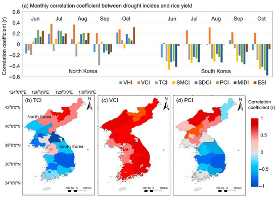 The correlation coefficients (r) between rice yields and each of the drought indices during the growing season over North Korea and South Korea (a). The correlation maps of TCI (b), VCI (c), and PCI (d) in July with respect to rice yield.