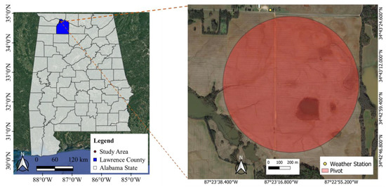 The study was conducted in a commercial cornfield in Lawrence County, Town Creek, Alabama (latitude 34°72′N; longitude 87°39′W), to evaluate the potential of using machine learning models associated with high-resolution satellite data and topographical indices to predict corn yield during the 2018–2019 growing seasons. The predominant soil type in the study field is Decatur silty clay loam with 2–10% slope variation, and the elevation varies between 169 and 180 m. The field was irrigated using a Reinke© center pivot irrigation system of 623 m length over 125 ha (Figure 1). A description of the sowing, tasseling, and harvest dates for 2018 and 2019 is shown in Table 2.