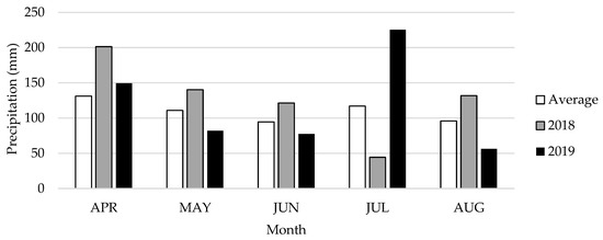 Total precipitation (average from 1999–2019, 2018, and 2019) during the growing seasons. A Vantage Pro 2 Plus weather station (model 6163, Davis Instruments, Hayward, CA, USA) located close to the field was used to record the precipitation data. Adapted from [42].