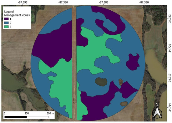 Three MZs were delineated by using information about elevation, slope, and soil texture, and by normalizing yield maps over ten years (Figure 3). This information was used as input into the Management Zone Analyst (MZA) software. This software was used to evaluate the number of homogeneous zones and MZ delineation [43]. We used the unsupervised algorithm fuzzy c-means to divide the field into three cluster classes. After the division, the MZs were adjusted based on known field variability of the farmer and researchers. A description of the soil texture of each MZ is presented in Table 3. A deeper understanding on how the MZs were delineated can be found in [42].