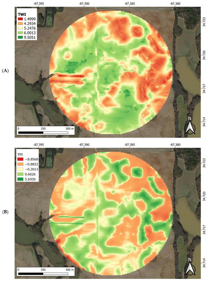 The TWI and TPI (Figure 4) were calculated using Equations (4) and (5), whereas the catchment area and slope that are required for the TWI equation were obtained using the interpolated map of elevation in the System for Automated Geoscientific Analyses (version 2.3.2):