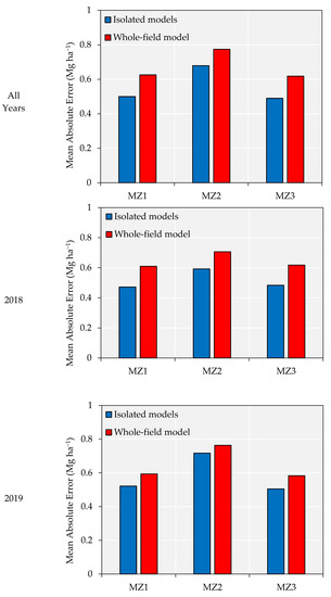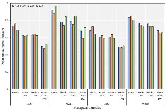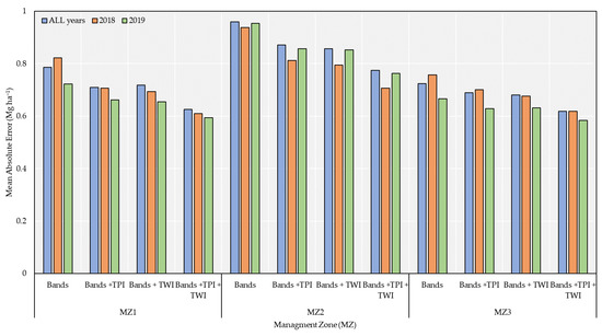 To compare the accuracy of the whole-field model and isolated model, we analyzed the specific accuracy of the best feature combination (spectral bands + TPI + TWI) against the accuracy of the specific models for each MZ (high, low, and intermediate yields; Figure 10) for the two scenarios (all years combined and specific season, 2018 and 2019). For all scenarios analyzed, the specific models showed better accuracy (lower MAE) than the whole-field model; however, for better understanding, and not only accuracy, it is enough to decide if we need site-specific models or a whole-field model.