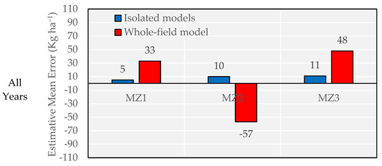 Comparison between the accuracy of the whole-field model and specific models for each management zone in three scenarios (all years combined, 2018 and 2019 season). MZ1, MZ2, and MZ3: management zones one (high yield), two (low yield) and three (intermediate yield), respectively.