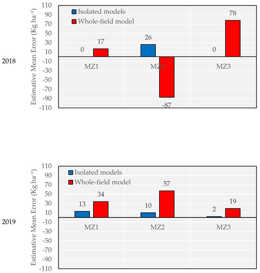 To analyze the tendency of the models, the EME was calculated and compared in the three scenarios (all years combined, 2018, and 2019) using models with spectral bands + TWI + TPI as features. All the comparisons were performed using specific models compared to the whole-field model, using its tendency in each MZ. The tendency metric allowed us to understand whether the model was underestimating or overestimating the yield prediction and to infer which approach had a lower tendency and which MZ occurred. For all years, the whole-field model underestimated the corn yield (−57 kg ha−1) in MZ2 (low-yield zone). Whereas for MZ1 (33 kg ha−1) and MZ3 (48 kg ha−1) the model overestimated. The MZ1 model (high-yield zone) showed approximately 55% lower tendency than the whole-field model in MZ1. This value had approximately 77% lower tendency for the model trained and validated using only the MZ3 data compared to the whole-field model (Figure 11). Underestimation of MZ2 was observed in the 2018 scenario (−87 kg ha−1), whereas in 2019 the whole-field model showed an overestimation (57 kg ha−1). The lowest tendency was observed in 2018 using site-specific models for MZ1 and MZ3, which was approximately zero. Based on these results, using site-specific models had lower tendency than using the whole-field model.