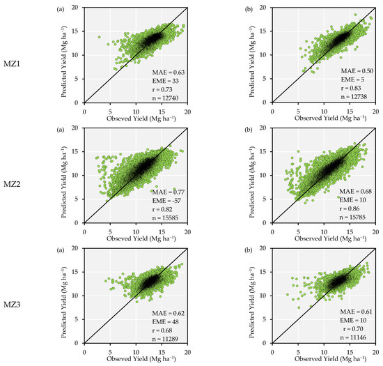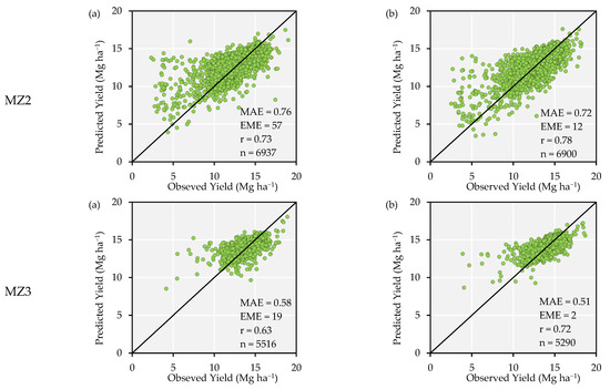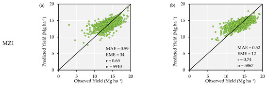 Our second observation supports the hypothesis that site-specific models using spectral bands, TPI, and TWI as features had different accuracies depending on the MZ used for the calibration and validation (MAE MZ1 = 0.50, MAE MZ2 = 0.68, and MAE MZ3 = 0.49). This leads us to infer that for MZs representing low-yield zones (MZ2), the corn yield forecasting accuracy was compromised due to lower accuracy (higher MAE and EME) (Figure 12).