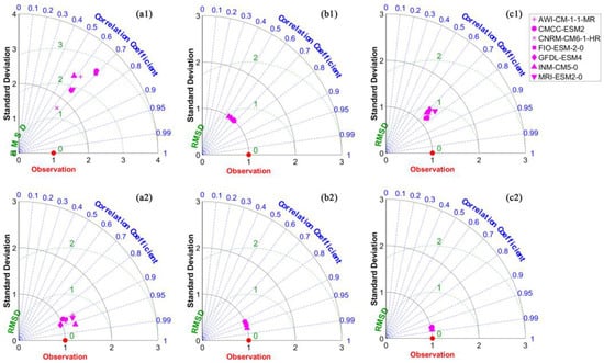 Standardized Taylor diagrams of precipitation and PET. (a1,a2): uncorrected CMIP6 model simulation precipitation and PET. (b1,b2): the result of quantile mapping (QM) correction. (c1,c2): the result of HQ correction. The correlation coefficients, standard deviation, and root mean square error are the mean of all pixels across QHTP.