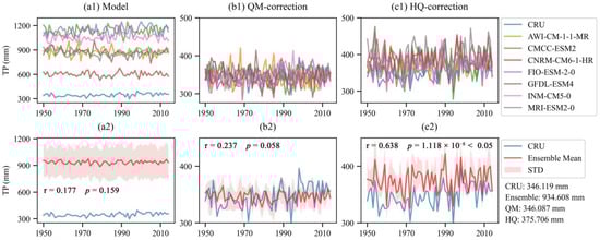 The curve of annual total precipitation over time in the historical scenarios. (a1,a2) are the comparison of the single model and the ensemble model with CRU data, respectively. (a–c) are the comparisons of the original, the QM-corrected, and the HQ-corrected precipitation, respectively (r is the Pearson correlation coefficient).
