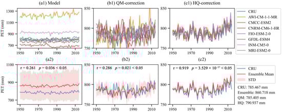The curve of annual PET over time in the historical scenarios. (a1,a2) are the comparison of the single model and the ensemble model with CRU data, respectively. (a–c) are the comparisons of the original, the QM-corrected, and the HQ-corrected PET, respectively (r is the Pearson correlation coefficient).