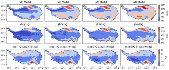 Spatial distribution and variation of annual mean total precipitation before and after HQ correction. (a–c) are, respectively, the original, the HQ-corrected, and the variation between them. a1–a4 are historical, SSP1-2.6, SSP2-4.5, and SSP5-8.5 scenarios, respectively.