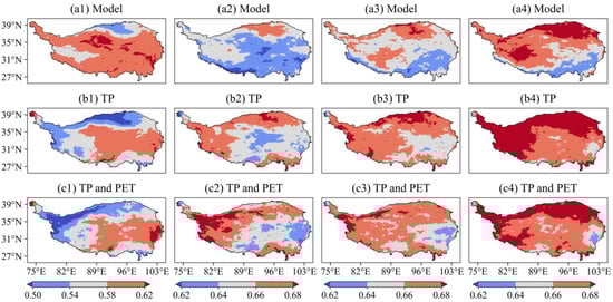 To quantify the impact of precipitation and PET correction on drought features, we initially quantified the spatial changes of variables before and after correction, as shown in Figure 6 and Figure 7. The corrected precipitation level lowers slightly but does not alter the spatial structure of the precipitation gradient zone, and the difference between the multi-year precipitation and the corrected value under the historical and future scenarios has a strong spatial consistency. According to Figure 7(b1–b4), rainfall is higher in southeast Tibet (>1000 mm) and lower in parched northwest Tibet (<200 mm). The correction percentages are less than zero in the majority of places, forming a C-shape around the Qiangtang Basin with a higher exterior (<−60%) and a lower basin (>−40%) (Figure 7(c1–c4)). The spatial pattern of potential evapotranspiration is different from that of precipitation, With high values primarily spread in the Qaidam Basin and southern Tibet (>1050 mm) and low values primarily distributed in the northwestern Plateau (<850 mm). The corrected value of PET, which has a narrower variable range than precipitation, notably increased in southern Tibet and northern Tibet (>0%), while decreasing in the majority of other locations (<0%). The spatial distribution of correction values of historical and future scenarios is consistent.