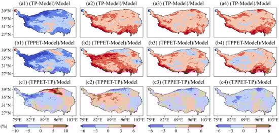 Spatial distribution and variation of annual mean PET before and after HQ correction. (a–c) are, respectively, the original, the HQ-corrected, and the variation between them. (a1–a4) are historical, SSP1-2.6, SSP2-4.5, and SSP5-8.5 scenarios, respectively.