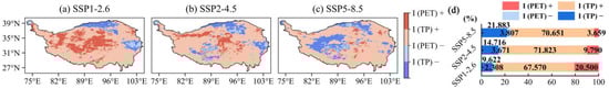 Dominant factors of drought intensity variation during HQ correction. (a–c) are SSP1-2.6, SSP2-4.5, and SSP5-8.5 scenarios, respectively. (d) is the statistical chart of (a–c). I (PET) + indicates that the increase in drought intensity is caused by changes in PET.