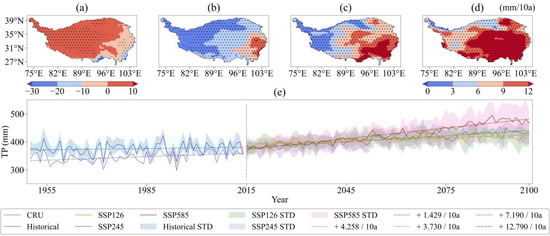 Trend test results of total precipitation for the HQ-corrected ensemble model. (a–d) represent the spatial trend of precipitation in the historical and future scenarios, respectively. The black dots are significant points with p < 0.05. (e) represents the change curve of the precipitation of the ensemble model in the historical and future scenarios. The filling on both sides of the line represents the respective standard deviation, and the dashed line is the trend line.