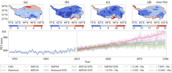 Trend test results of PET for the HQ-corrected ensemble model. (a–d) represent the spatial trend of precipitation in the historical and future scenarios, respectively. The black dots are significant points with p < 0.05. (e) represents the change curve of the precipitation of the ensemble model in the historical and future scenarios. The filling on both sides of the line represents the respective standard deviation, and the dashed line is the trend line.